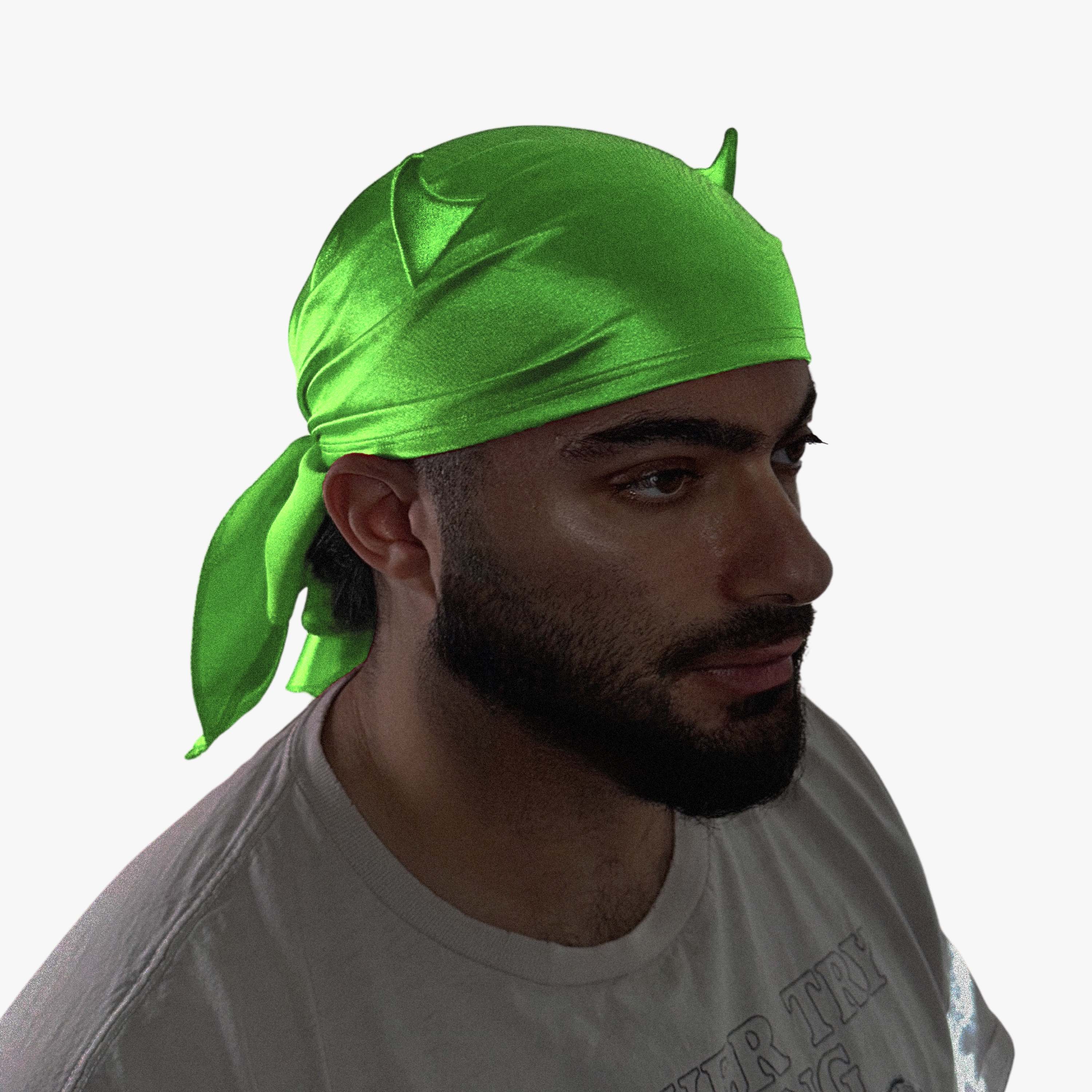 Make a statement with the Horny Bandana, available in satin-like neon green. Crafted from soft, breathable spandex, this bandana blends comfort with bold style. Featuring stitched devil horns, it takes a classic accessory and gives it a mischievous twist. Whether you’re at a festival, party, performance, or just want to add playful energy to your look, the Horny Bandana is designed to turn heads and spark conversation.
