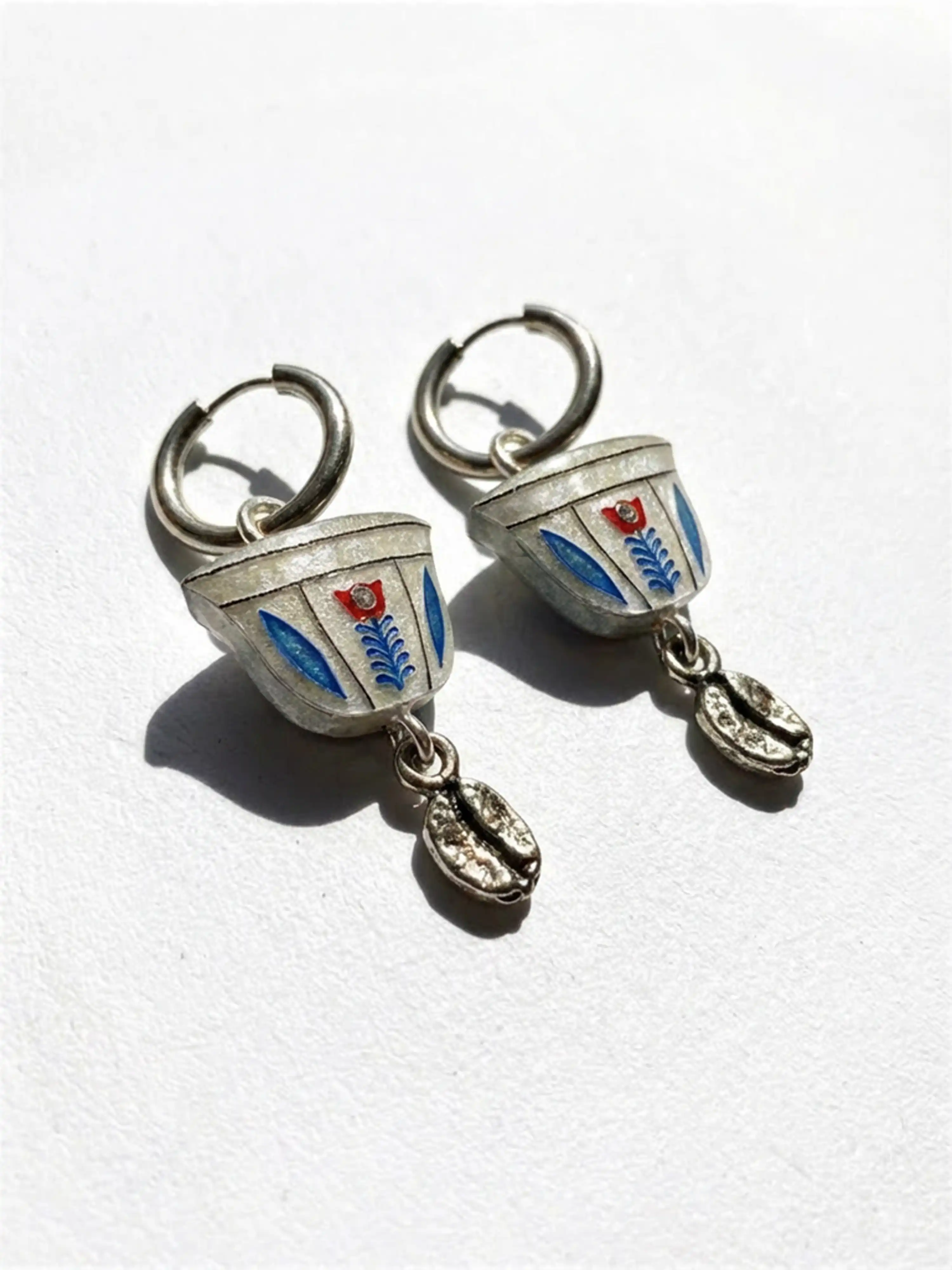 Inspired by the nostalgic porcelain cups used to serve traditional Armenian coffee, these Soorj Silver Hoops capture the warmth of slow mornings, kitchen conversations, and the familiar comfort of soorj shared with family and friends. The detailed cup charm features classic decorative motifs, with a small silver coffee bean dangling below. An ode to the rich, bold brew that brings people together. Each charm is made from layered acrylic with hand-inked details and hangs from stainless steel silver hoops. The charms are removable so you can mix and match them with other designs or wear the hoops on their own. Lightweight and comfortable for all-day wear, these earrings are handmade in small batches and arrive ready for gifting. Designed and handmade in Los Angeles.